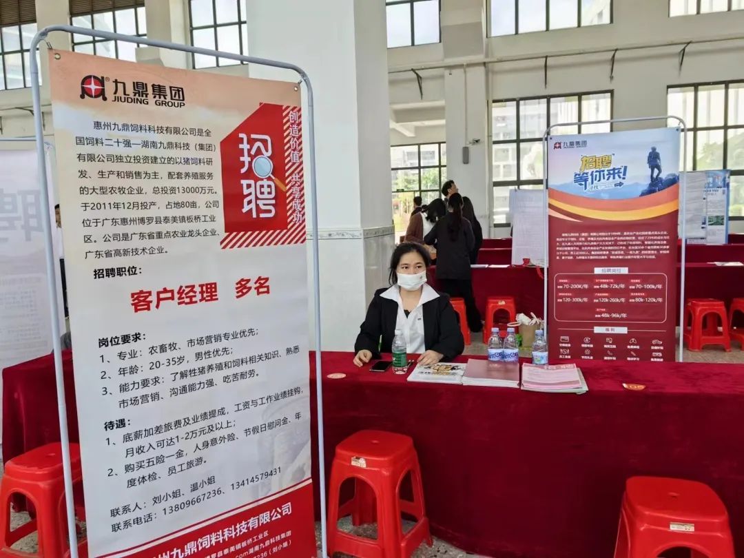 至今為止,集團(tuán)人力行政中心聯(lián)動(dòng)各分子公司人力先后參加了長(zhǎng)沙大學(xué)、湖南財(cái)經(jīng)學(xué)院、湖南工商大學(xué)、湖南涉外經(jīng)濟(jì)學(xué)院、湖南農(nóng)業(yè)大學(xué)、長(zhǎng)江大學(xué)、惠州工程職業(yè)技術(shù)學(xué)院、岳陽職業(yè)技術(shù)學(xué)院、江西生物科技職業(yè)學(xué)院、湖南文理學(xué)院等多家高校的校園招聘會(huì),參加的分子公司有湖南九鼎農(nóng)牧、襄陽九鼎、惠州九鼎、東鄉(xiāng)九鼎、常德九鼎等。