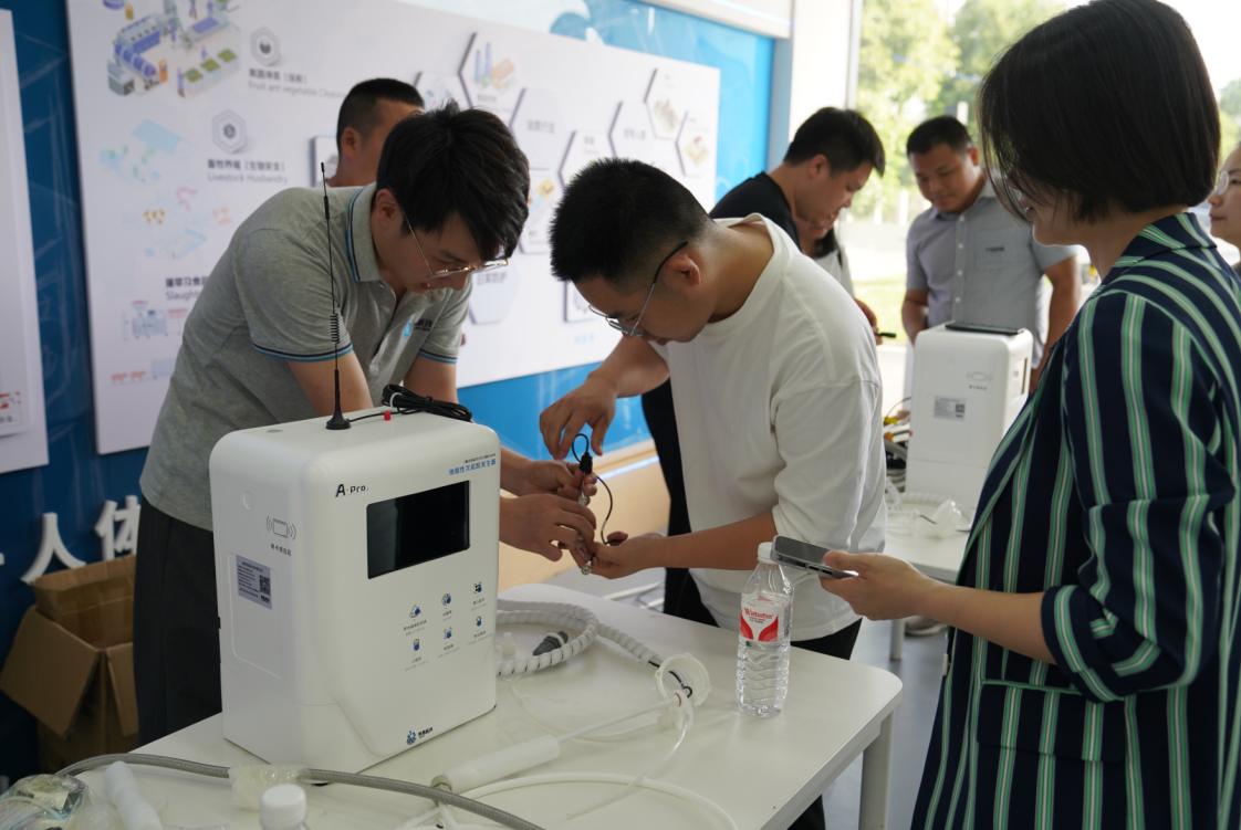 隨后潤農羅清經理介紹母豬飼喂器、懷孕飼喂器和粥料器等智能飼喂設備的應用場景及價值點,展示飼喂器實物和講解安裝操作方法。接著至潤農展廳進行參觀,現場進行設備安裝調控操作和控制平臺操作的培訓,確保每個服務老師能講、能裝、能調試、能維護,為客戶實現膘體管控+潤農飼喂器的“一條龍”服務。